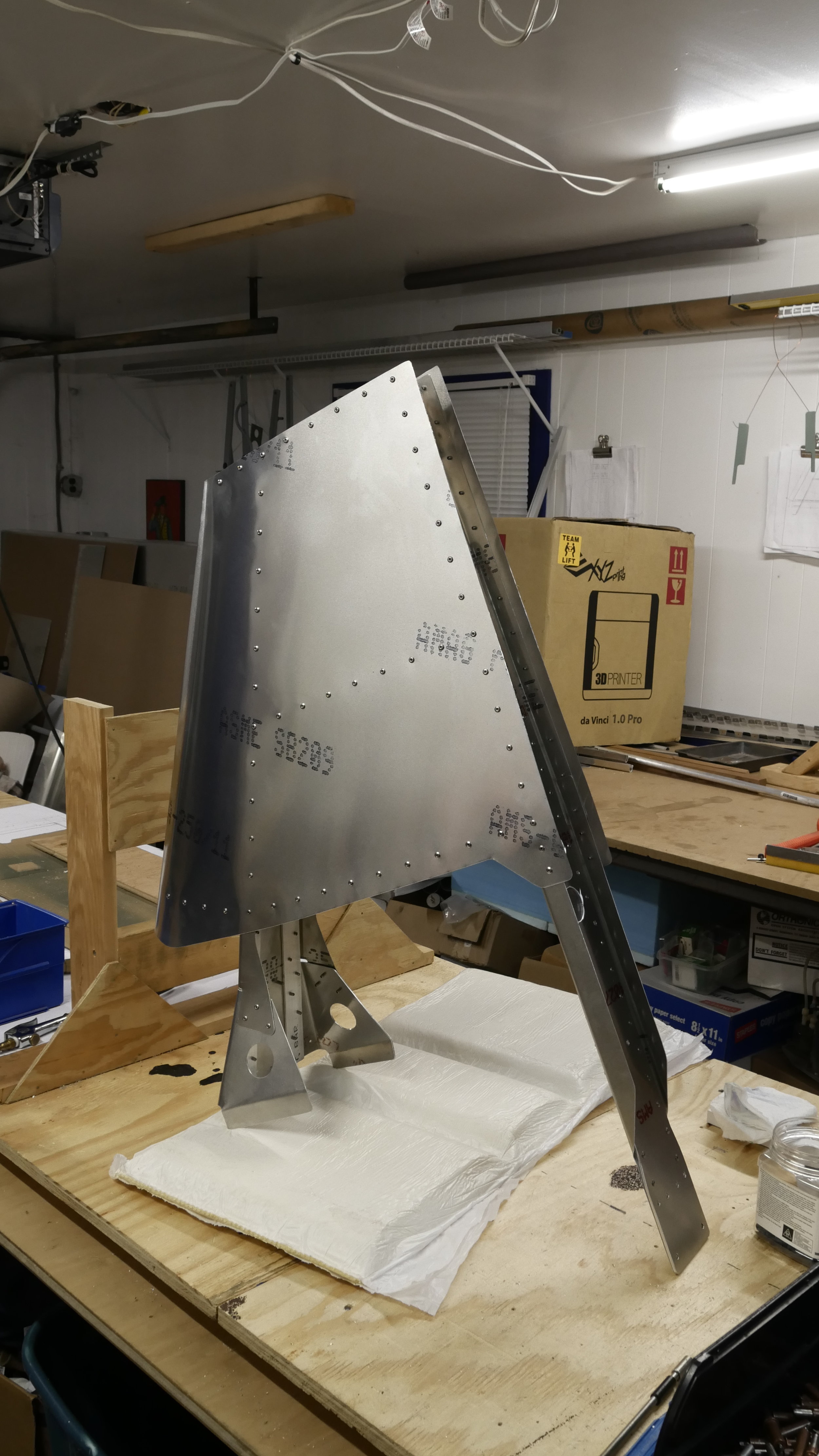 To start actual assembly we went and finished deburring all holes and riveted the spars together, then ribs went to the spars. This frame for the vertical was fairly stout to begin with, and being pre-cut the pieces all fit up just so; but it needed to be held absolutely square and straight. So next was a vertical stab assembly fixture, which was made from some braces I had made for welding the canopy frame, and these got squared to the table with a laser. We could have made a nicer looking fixture on the router table from MDF but Scott was working on other stuff, we didn't want to wait, and it works just fine doing it by hand this way. With the frame screwed to the table its very stiff and secure.